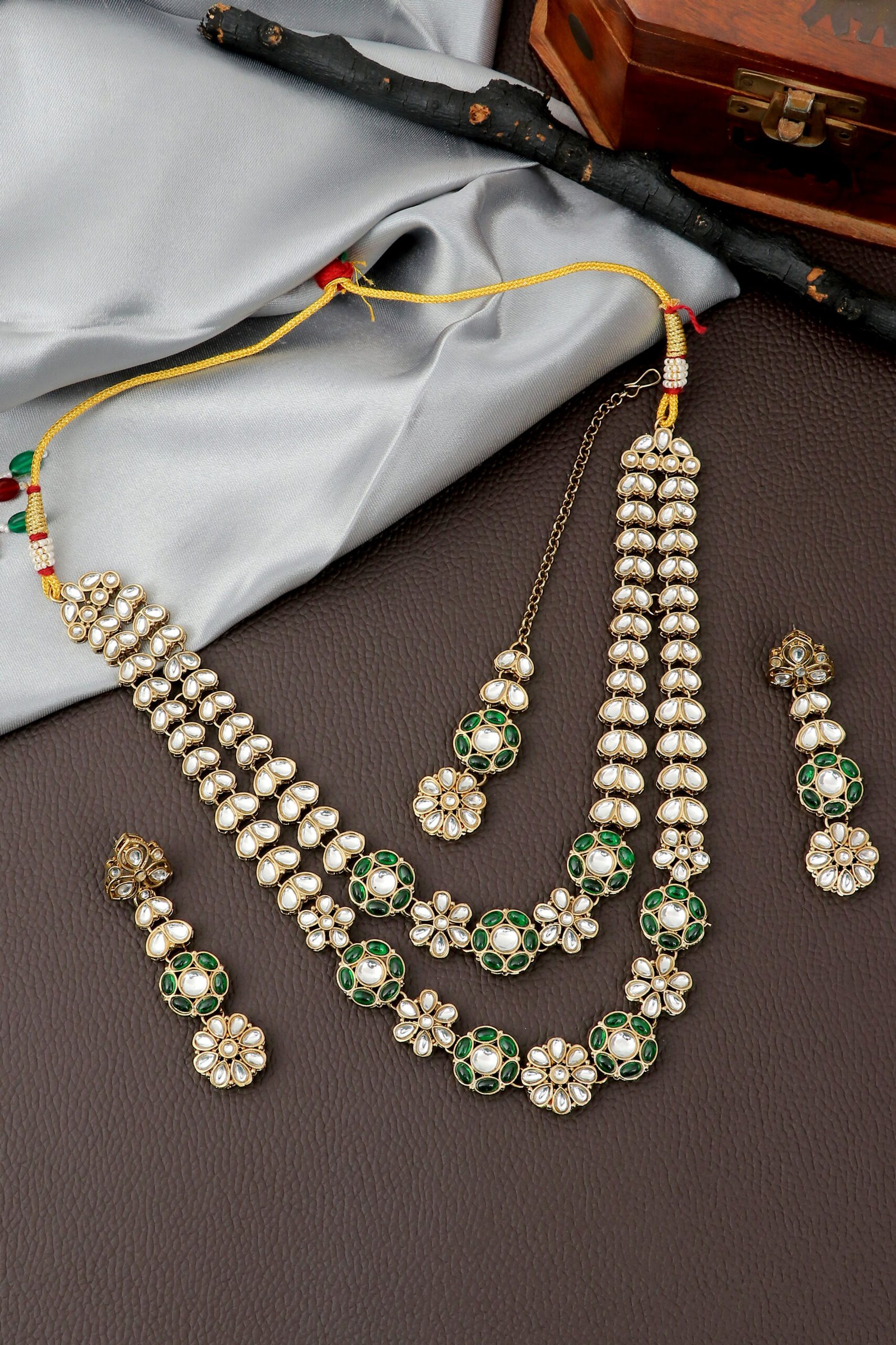 Adorn yourself with the grandeur of this Double-Layer Kundan and Pearl Necklace Set. The twin strands of interconnected, elegant floral clusters, lavishly studded with bright Kundan and faux pearls, create a breathtaking effect. The rich emerald green stone highlights add a touch of royalty, perfectly complementing the included long drop earrings and matching Maang Tikka. This timeless, gold-plated ensemble promises to elevate any bridal or festive look.