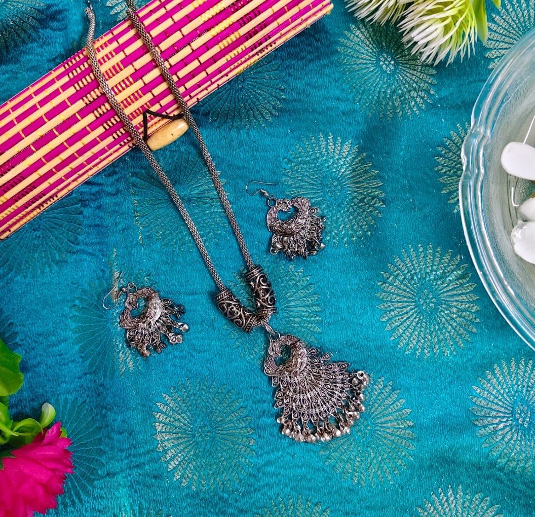 This oxidized silver necklace set showcases elegant peacock motifs, paired with matching jhumka earrings. Its detailed design and antique finish make it perfect for festive celebrations, cultural events, or everyday ethnic wear.