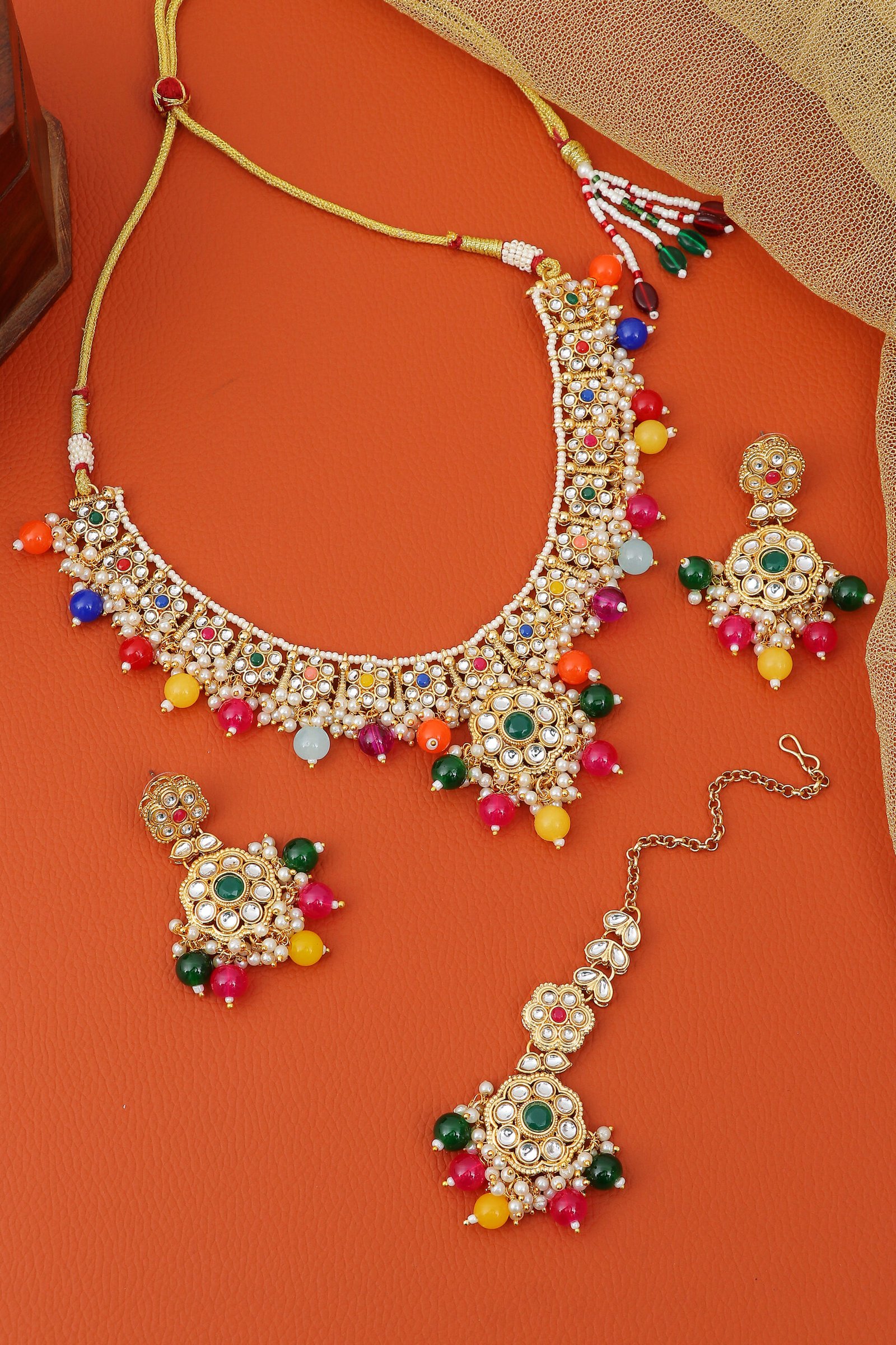 Make a grand statement with this stunning multicolor Kundan pearl necklace set. Designed with intricate detailing, this set includes a necklace, earrings, and maang tikka crafted in premium gold-plated finish. Perfect for brides and festive occasions, it blends timeless tradition with a vibrant modern touch.
